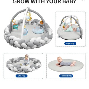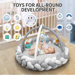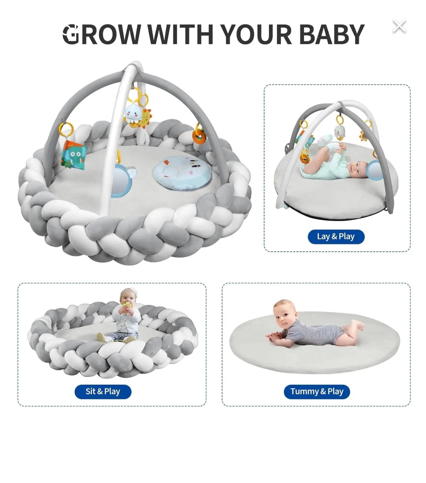 تصميم آمن ومريح: يتميز بساحة لعب دائرية ذات حواف مرتفعة ومحبوكة على شكل ضفيرة سميكة وناعمة باللونين الأبيض والرمادي. هذا الإطار المبطن يوفر حماية إضافية ويشجع على وقت الاستلقاء على البطن (Tummy Time) في بيئة محصورة وآمنة.