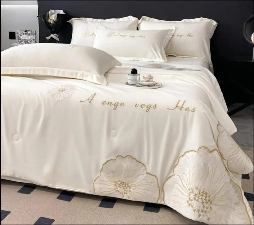 طقم لحاف صيفي يتميز بخامة حرير جليدي ناعمة تمنح إحساسًا باردًا منعشًا طوال الليل.